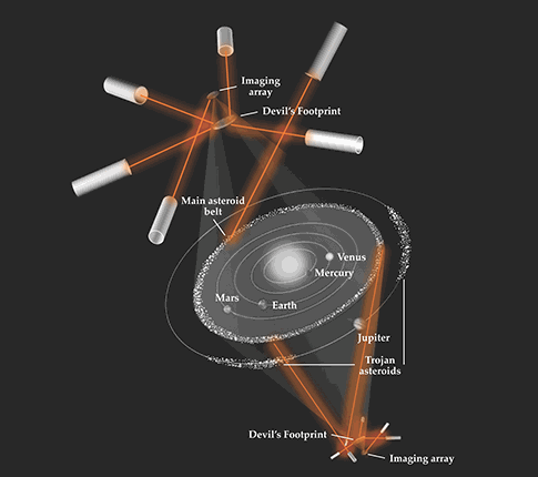 地球上看去像是煙火的高強度雷射脈衝,正將數十億顆大小為1-10 m級的小行星打造成一個直徑為5 個天文單位的巨型天文望遠鏡的子鏡(天文單位AU是距離單位,相當於地球繞太陽的軌道半徑)