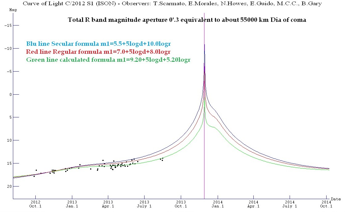 右圖中的綠線,就是根據新彗星行為所做的艾桑彗星亮度變化預測,此預測以艾桑彗星絕對星等為+9.73等進行計算,得出即使在最亮時的亮度也僅有+4~+5等