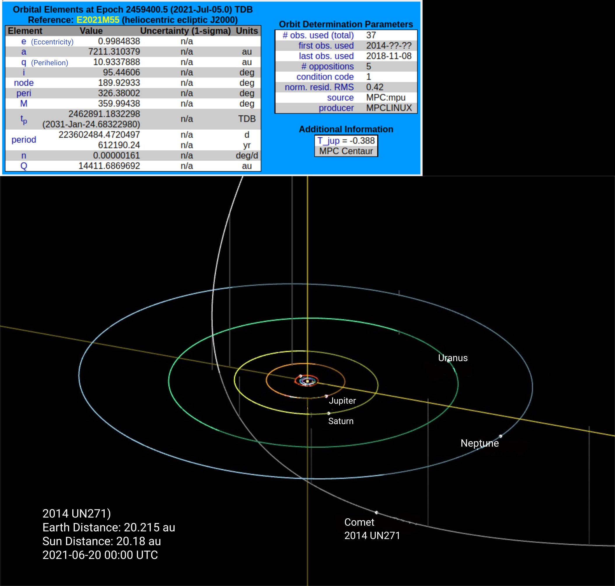 2014 UN271 took around 1.5 million years to complete half an orbit from its furthest distance of 40,000 AU (0.6 ly) in the Oort cloud.[4] It will come to perihelion (closest approach to the Sun) around 20 January 2031 at a distance of 10.95 AU[5] which is just outside of Saturn’s orbit. The outbound orbital period will be approximately 3.5 million years with an aphelion distance of about 55,000 AU (0.9 ly).[4] The object is only very loosely bound to the Sun