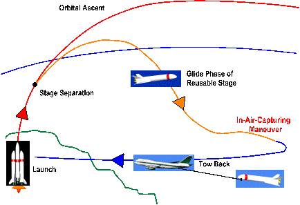 德宇航提出的空中捕獲方案(IAC)與ULA回收發動機採取的MAR有很大區別,這不是傘降減速並用直升機勾取的方案,而是用飛機拉這箭體在空中滑翔,其工作過程如圖3所示: