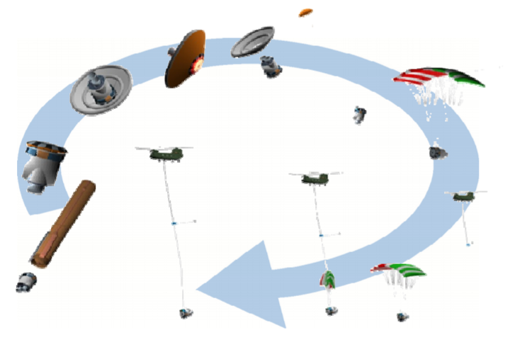 接著充氣隔熱罩帶著它們再入大氣層以防止被焚毀,快到地面時降落傘會部署,而直升機會在半空中接住它們。