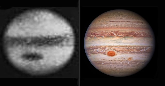 這張在 19 世紀拍攝的照片雖然微粒甚粗糙,但大致仍可以辦認到木星獨特的帶狀結構與標誌性的大紅斑。值得一提的是,Clerke 的照片是顛倒的,所以大紅斑的位置變成在左上角。即使照片的細節不多,但科學家仍然能比較到,在一個半世紀前,大紅斑(實際上是反氣旋風暴)可以吞噬 3 個地球,但到今天,這場太陽系中最巨大的風暴看來已經減弱,目前僅有 1 個地球的大小。