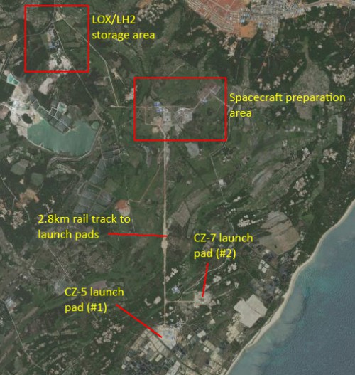 Hainan Island launch pads for the Long March 5 and smaller Long March 7 rockets are visible in this overhead shot. There are separate Vehicle Assembly Buildings for each launch pad. Photo Credit: China Space Blog / Bing