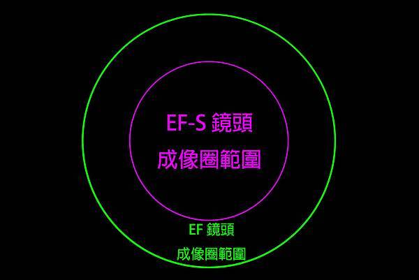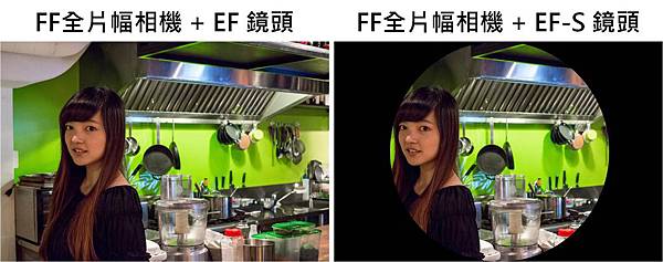 若你硬是將 EF-S 鏡頭用在 FF 全片幅相機上,由於成像圈不夠大,自然只能顯示中心部分區域,週邊為黑色區塊。