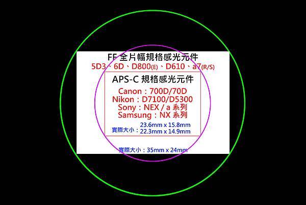 這裡要留意,EF 鏡頭成像圈面積,大過 APS-C 感光元件,所以在 70D/700D 等APS-C 規格相機也可以用 EF 鏡頭,反之 EF-S 鏡頭成像圈太小,無法適當的用在 FF 相機身上。