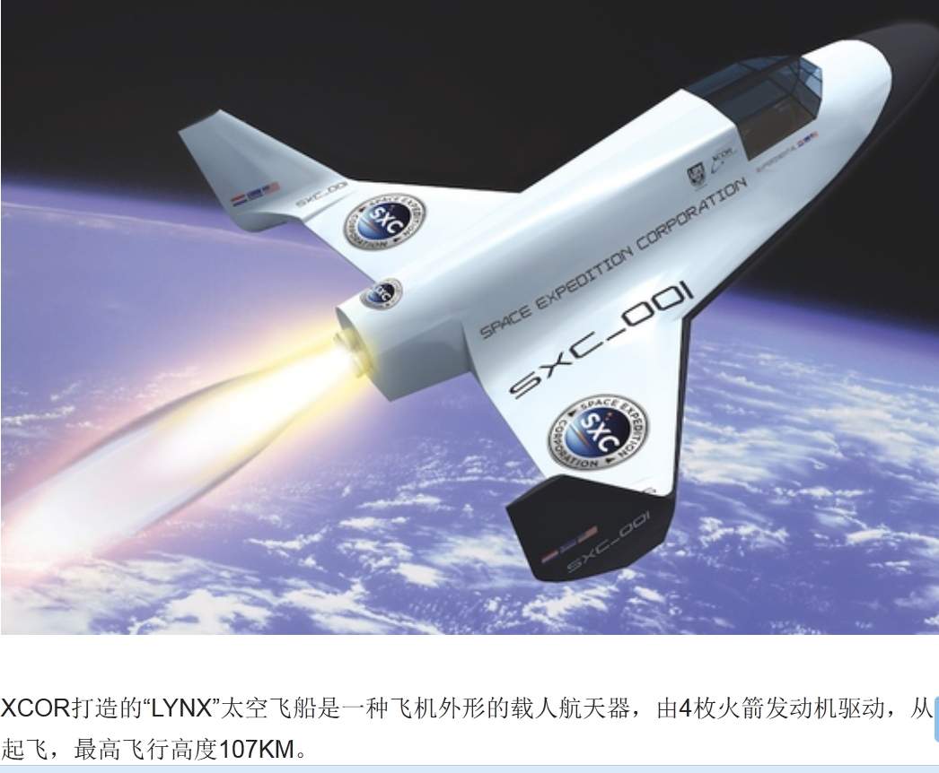 他们宣称:一场改变人生的体验。任务:搭乘XCOR的“山猫(Lynx)”号太空飞船,就绑定在驾驶员身旁,这注定是一场从头到尾都激动人心的旅程。山猫号从跑道上起飞,快速爬升到三倍音速。在大约58公里的高度,飞行员关闭发动机,让你依靠惯性进入太空。经历了数分钟失重状态后,飞机重新进入大气层。当飞机以一系列密集的圆圈降落时,你会体验到4G的加速度,之后才减速降落在跑道上。虽然没有在机舱内漂浮的体验,但你可以与驾驶员坐在飞机的最尖端位置欣赏太空。XCOR将使用火箭推进器到达平流层高度,之后再降落返回地面。
