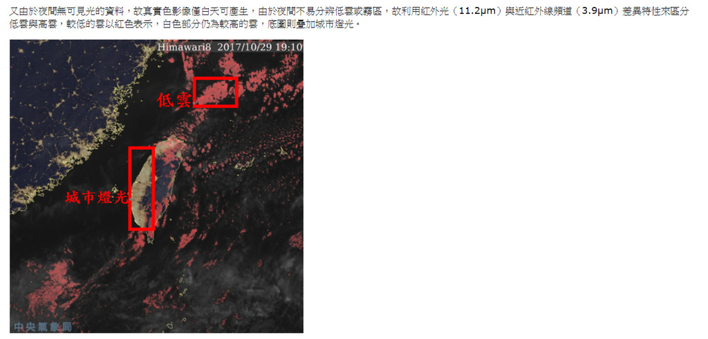 由於夜間不易分辨低雲或霧區,故利用紅外光(11.2μm)