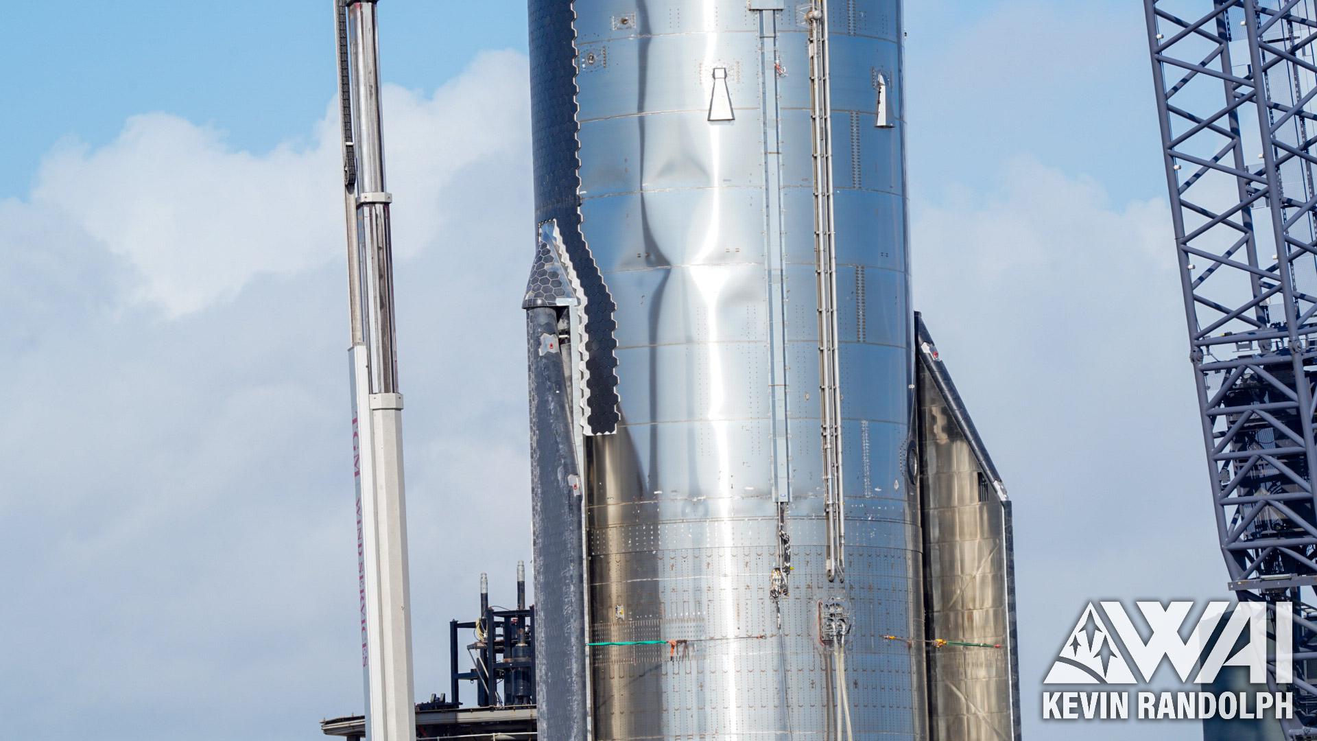 星舰拍摄的星舰S24,通过照片可见到舰翼部分已经变形了,估计是前两天进行的低温加注测试导致的。