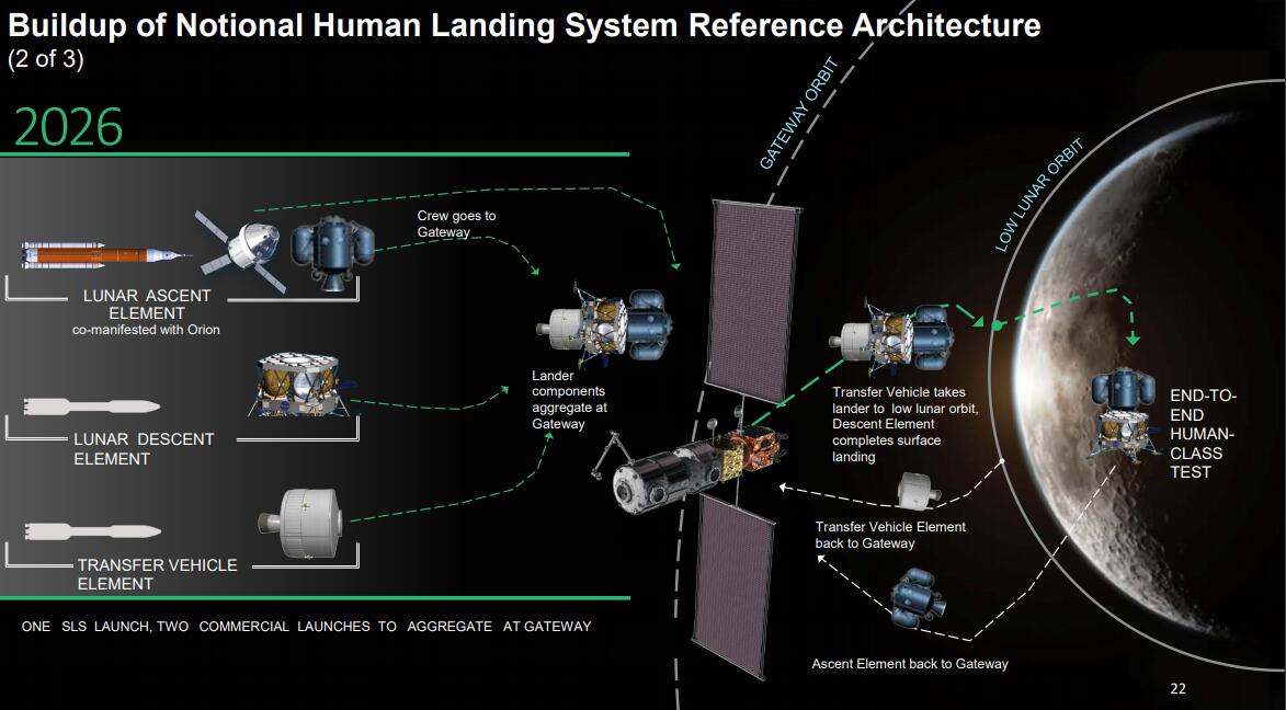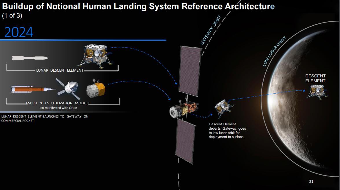 第一點是登月將利用月球軌道上的 Lunar Gateway 太空站,做為太空人、物資、與油料的中轉中心,減少一次性需要由地球發射的總重量;而第二點則是 NASA 將依照讓民間火箭能送太空人到太空站的合約一般,開放民間廠商依照 NASA 設計的任務架購,來投標新的太空載具。初步 NASA 將提供提案的公司最高 900 萬美元的經費,進行更細步的研究。