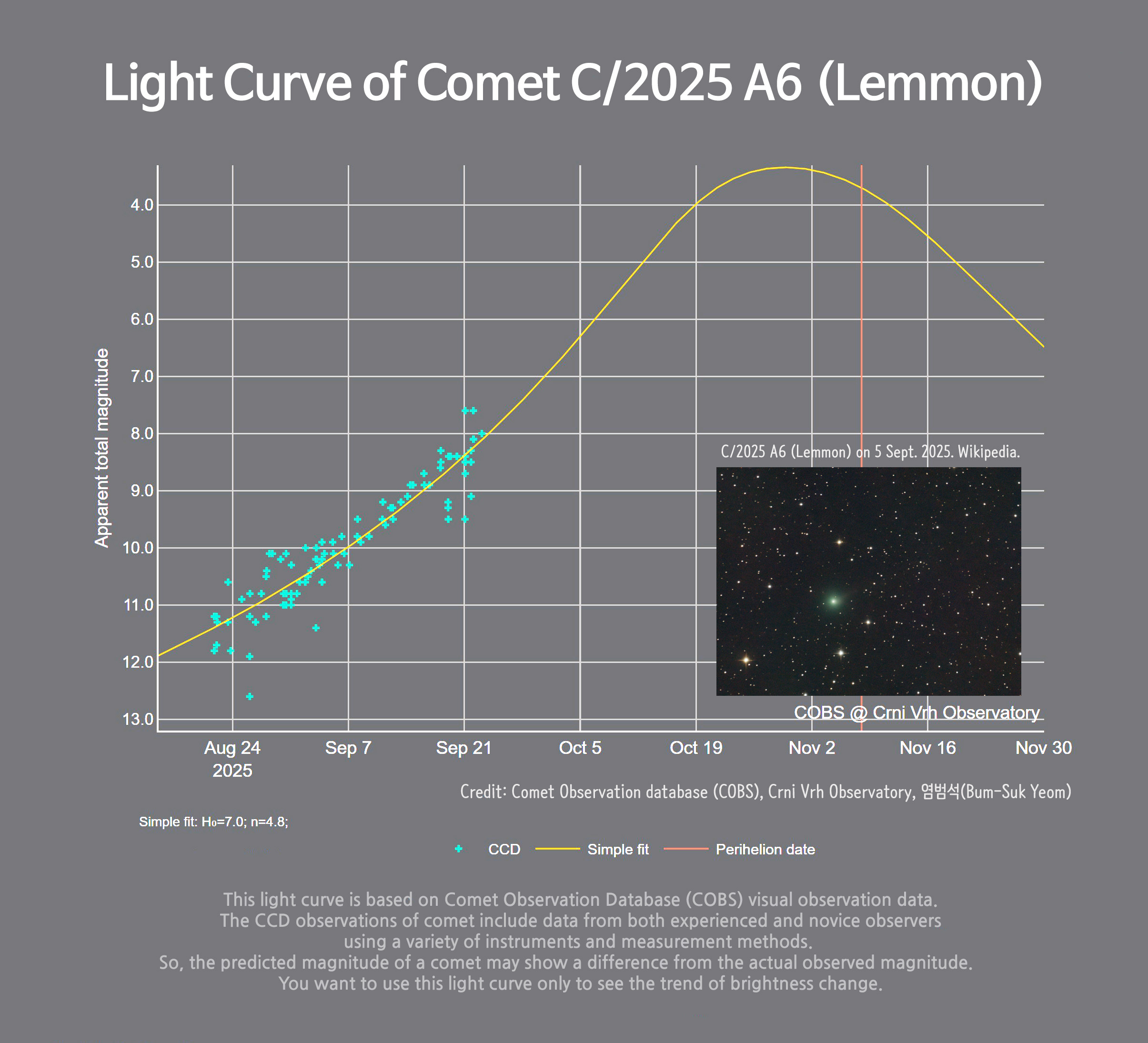 近地點:2025年10月21日(約8等) => 改到 5 等 => 3.7等 => 下修 4.4