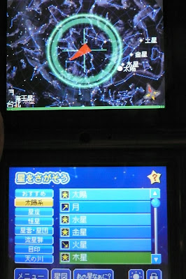 卡片後方內置有六軸方向感應器,使得程式可以導引你朝向你想看的天體的方向,或者查尋你目前面對的是哪個星座或星體,這是它主要的功能,這兩項功能即使不懂日文用起來也不會有什麼阻礙,關於星座的名稱,網路上可以查到中英日對照表,至於它附屬的一些天文常識,這些文章在許多書籍媒體等都已經讀得到,也就不必要非得在DS上閱讀,所以讀不讀得懂日文就不是那麼地重要。在星空導覽的星圖中可以選擇顯示素描圖,可以用來輔助辨識星座。